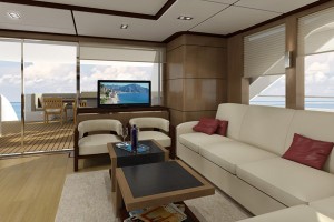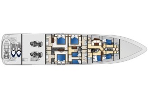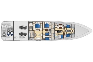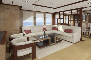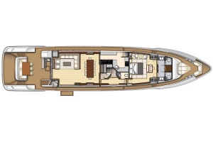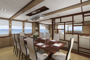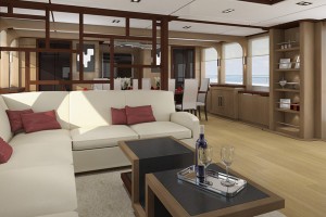主甲板設有豪華客廳,採用全景窗設計,帶來壯闊視野與自然採光;正式餐區與寬敞起居空間,為賓主共聚提供理想場域。全寬的主人套房彷若私人天地,配備豪華衛浴,寬敞舒適;多間賓客艙則確保每位乘客皆享尊榮與私密。
